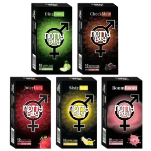 Turn up the excitement with the Notty Boy 50 Condom Pack (Variety Pack) — a playful mix of five irresistible flavors designed for ultimate pleasure and safety.
