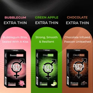 Add fun and flavor to your intimate moments with the Notty Boy 50 Condom Variety Pack! Includes Strawberry, Chocolate, Green Apple, Banana & Bubblegum flavors — all extra thin, lubricated, and made from premium natural latex.